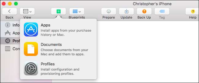 जब प्रक्रिया समाप्त हो जाती है, तो कॉन्फ़िगरेशन प्रोफ़ाइल को स्थापित करने का समय आ गया है। Apple कॉन्फ़िगरेशन विंडो में डिवाइस को डबल-क्लिक करें, साइडबार में "प्रोफाइल" पर क्लिक करें, "ऐड" बटन पर क्लिक करें, और फिर आपके द्वारा पहले बनाई गई कॉन्फ़िगरेशन प्रोफ़ाइल फ़ाइल का चयन करें।