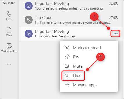 यदि आप अपनी चैट व्यवस्थित करना चाहते हैं, तो उन लोगों को छिपाना जिन्हें आपको देखने की आवश्यकता नहीं है, यह शुरू करने के लिए एक अच्छी जगह है। माइक्रोसॉफ्ट टीमों में चैट को छिपाने के लिए, इसके बगल में तीन-डॉट मेनू आइकन पर क्लिक करें और संदर्भ मेनू से "छुपाएं" का चयन करें।