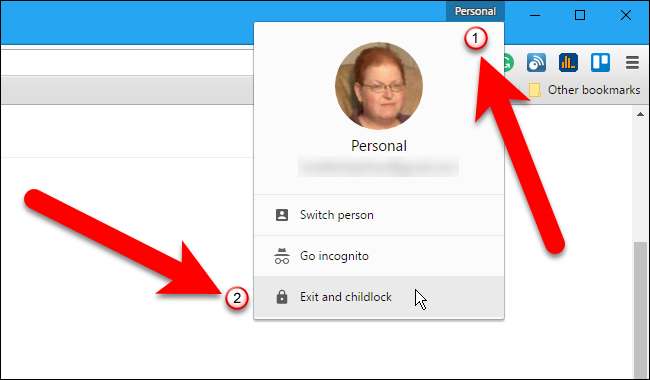 अब, जब आप उस पर अपने प्रोफ़ाइल नाम के साथ ब्राउज़र विंडो के शीर्ष पर बटन पर क्लिक करते हैं, तो आप क्रोम को बंद करने और अपनी प्रोफ़ाइल को लॉक करने के लिए "बाहर निकलें और चाइल्डलॉक" का चयन कर सकते हैं।