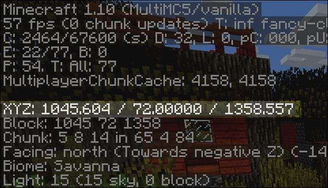 इन-गेम निर्देशांक के साथ कमांड। Minecraft के प्रत्येक स्थान पर एक उत्तर / दक्षिण / पूर्व / पश्चिम मूल्य (एक्स और जेड द्वारा नीचे दर्शाया गया है) और एक ऊंचाई मूल्य (वाई से संकेत दिया गया है) है। आप प्ले के दौरान F3 दबाकर (जो डिबग स्क्रीन लाता है) इन मूल्यों की जांच कर सकते हैं और "XYZ:" लेबल वाले ऊपरी बाएँ कोने में मान की तलाश कर रहे हैं, जैसे: