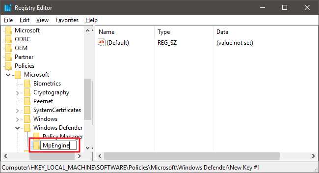 इसके बाद, आप विंडोज डिफेंडर कुंजी के तहत एक नया उपकुंजी बनाने जा रहे हैं। विंडोज डिफेंडर आइकन पर राइट-क्लिक करें और नया> कुंजी चुनें। नई कुंजी MpEngine का नाम दें।