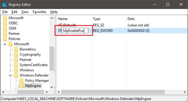 ये हैक वास्तव में सिर्फ एक नई MPEngine कुंजी है जिसे हमने .REG फ़ाइल में निर्यात किया है। सक्षम करें PUP स्कैनिंग हैक को चलाना नई कुंजी और MpEnablePus मान को जोड़ता है और मान को 1 पर सेट करता है। चल रहे PUP स्कैनिंग हैक को चलाने से मान 0. पर सेट होता है और यदि आप रजिस्ट्री के साथ फ़िडलिंग का आनंद लेते हैं, तो यह सीखने का समय है। कैसे अपनी खुद की रजिस्ट्री हैक करने के लिए .