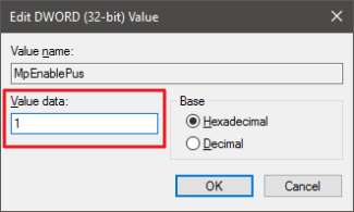 इसके बाद, आप उस मूल्य को संशोधित करने जा रहे हैं। नए MpEnablePus मान को डबल-क्लिक करें और मान को "मूल्य डेटा" बॉक्स में 1 पर सेट करें।