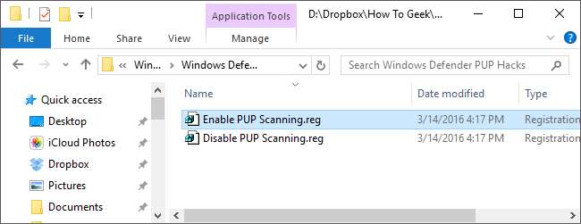 यदि आप खुद को रजिस्ट्री में गोताखोरी की तरह महसूस नहीं करते हैं, तो हमने दो डाउनलोड करने योग्य रजिस्ट्री हैक बनाए हैं जिनका आप उपयोग कर सकते हैं। एक हैक विंडोज डिफेंडर में PUP स्कैनिंग को सक्षम करता है और दूसरा इसे फिर से बंद कर देता है। दोनों निम्नलिखित ज़िप फ़ाइल में शामिल हैं। जिसको आप उपयोग करना चाहते हैं उस पर डबल क्लिक करें, संकेतों के माध्यम से क्लिक करें, और फिर अपने कंप्यूटर को पुनरारंभ करें।