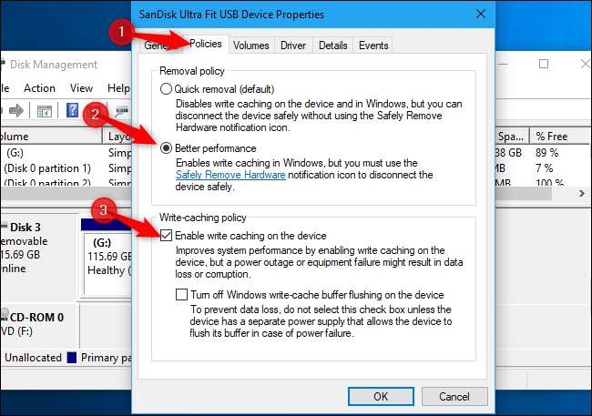 "बेहतर प्रदर्शन" विकल्प इस मंदी को समाप्त करता है। इस विकल्प के साथ, विंडोज ड्राइव को संचालन लिख देगा और एप्लिकेशन को आगे बढ़ने देगा जैसे कि उन्होंने पहले ही डेटा लिखा था। विंडोज तब बैकग्राउंड में राइट ऑपरेशन करता है। कि आवेदन स्नैपर बना सकते हैं।