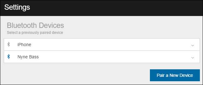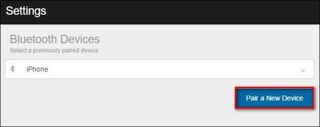 यहां आपको किसी भी पुराने डिवाइस को देखा जाएगा, जिसमें किसी भी डिवाइस को शामिल किया गया है, जिसे आप इको को ब्लूटूथ स्पीकर के रूप में उपयोग करने के लिए जोड़ सकते हैं (जैसे कि "iPhone" नीचे दी गई प्रविष्टि के रूप में)। किसी नए डिवाइस को पेयर करने के लिए नीले रंग में "Pair a New Device" बटन पर क्लिक करें।