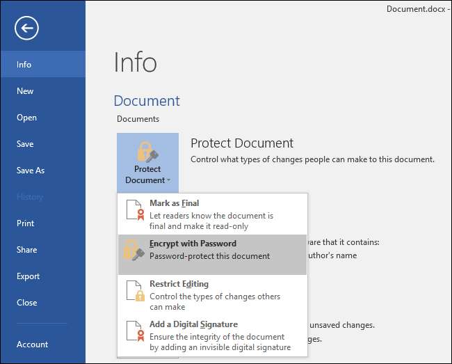 इसके अलावा, यदि आप आधुनिक दस्तावेज़ स्वरूपों जैसे .docx को सहेज रहे हैं, तो केवल कार्यालय का एन्क्रिप्शन अच्छी तरह से काम करता है। यदि आप पुराने दस्तावेज़ स्वरूपों को सहेजते हैं जैसे .doc-जो कि Office 2003 के साथ संगत हैं और पहले-Office एन्क्रिप्शन के पुराने, सुरक्षित संस्करण का उपयोग नहीं करेंगे।