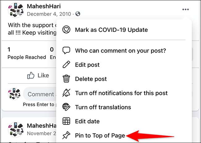 तीन-डॉट्स मेनू से, "पृष्ठ के शीर्ष पर पिन" का चयन करें।