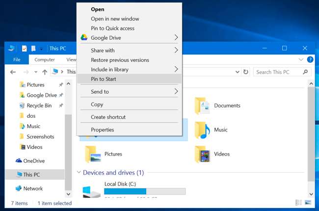 आप ड्राइव को राइट-क्लिक भी कर सकते हैं - जैसे आपका C: या D: ड्राइव - और अपने स्टार्ट मेनू में ड्राइव को पिन करने के लिए "पिन टू स्टार्ट" चुनें। यह पुस्तकालयों, नेटवर्क स्थानों और के साथ भी काम करता है होमग्रुप फ़ाइल एक्सप्लोरर में फ़ोल्डर।