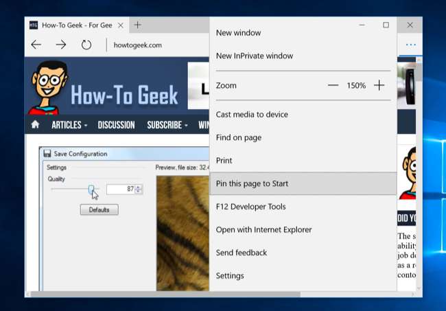 Microsoft एज ब्राउज़र आप वेबसाइटों के लिए शॉर्टकट पिन करने की अनुमति देता है। एज ब्राउज़र खोलें और उस वेब पेज पर नेविगेट करें जिसे आप पिन करना चाहते हैं। मेनू बटन पर क्लिक करें और "इस पृष्ठ को प्रारंभ पर पिन करें" चुनें।