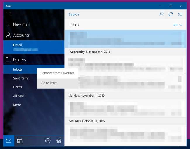 आप अपने स्टार्ट मेनू में मेल ऐप से आइटम पिन कर सकते हैं। उदाहरण के लिए, यदि आपके पास कई खाते हैं, तो आप एक विशिष्ट खाते या दो के लिए एक शॉर्टकट पिन कर सकते हैं। यदि आप एक से अधिक फ़ोल्डर सेट करते हैं, तो आप किसी फ़ोल्डर में शॉर्टकट पिन कर सकते हैं।