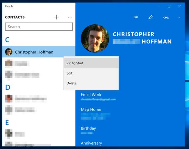 आप प्रारंभ मेनू में भी संपर्क पिन कर सकते हैं। विंडोज 10 के साथ शामिल "लोग" ऐप खोलें और एक संपर्क का पता लगाएं। उस संपर्क पर राइट-क्लिक करें या लंबी-प्रेस करें और अपनी स्टार्ट स्क्रीन पर संपर्क पिन करने के लिए "पिन टू स्टार्ट" चुनें।