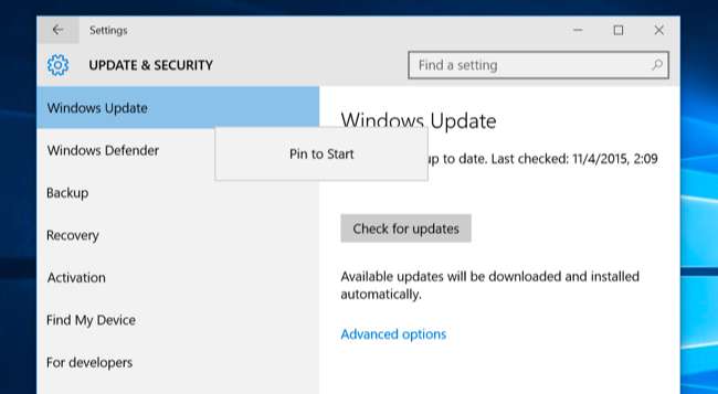 आइकन या श्रेणी को राइट-क्लिक करें (या लंबे समय से दबाएं) और "पिन टू स्टार्ट" चुनें। उदाहरण के लिए, आप इसका उपयोग विंडोज अपडेट स्क्रीन, या सेटिंग ऐप में किसी अन्य स्क्रीन पर एक त्वरित शॉर्टकट बनाने के लिए कर सकते हैं।