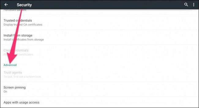 सेटिंग्स में, सुरक्षा सेटिंग्स को खोलने के लिए "सुरक्षा" लेबल पर टैप करें और फिर उन्नत शीर्षक पर स्क्रॉल करें और "स्क्रीन पिनिंग" टैप करें।