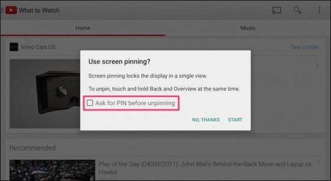 जब आप उस आइकन पर टैप करते हैं, तो एक डायलॉग आपसे पूछेगा कि क्या आप स्क्रीन पिनिंग का उपयोग करना चाहते हैं। अपनी स्क्रीन को अनपिन करने के लिए, एक ही समय में "बैक" और "ओवरव्यू" बटन दबाए रखें।