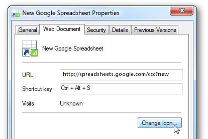 शॉर्टकट बदलने के लिए, बस उस पर राइट-क्लिक करें और संदर्भ मेनू से गुण का उपयोग करें, फिर वेब दस्तावेज़ टैब पर फ्लिप करें यदि आप पहले से ही नहीं हैं। यहां से, आप शॉर्टकट कुंजी को उस चीज़ को अनुकूलित कर सकते हैं जिसे आप पसंद कर रहे हैं, और एक अलग आइकन असाइन करें।