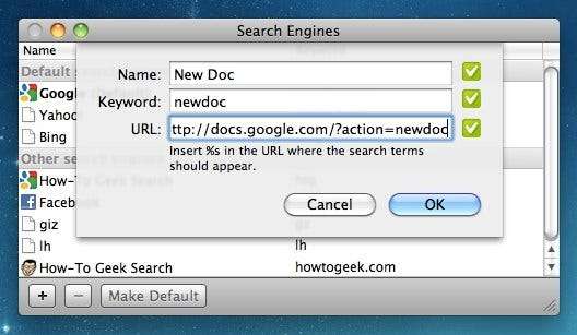 वहां से, आप एक नए "खोज इंजन" में जोड़ सकते हैं, लेकिन इसके बजाय, केवल एक नया Google दस्तावेज़ बनाने के लिए URL का उपयोग करें। इस तरह आप केवल कीवर्ड को स्थान बार में दर्ज कर सकते हैं, और यह एक नया दस्तावेज़ बना देगा।