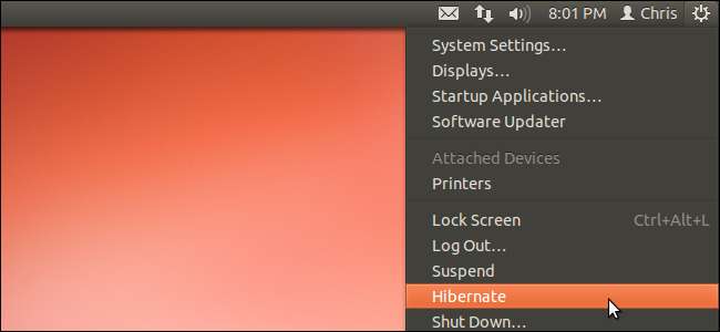 यदि आप केवल उबंटू 12.04 में अपडेट किए गए हैं, तो आप इसके सिस्टम मेनू में गायब एक विकल्प देख सकते हैं। हाइबरनेट विकल्प अब डिफ़ॉल्ट रूप से छिपा हुआ है, लेकिन आप इसे वापस पा सकते हैं यदि आप अपने सिस्टम को हाइबरनेट करना पसंद करते हैं।