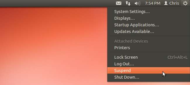 सस्पेंड का विकल्प अभी भी उबंटू के सिस्टम मेनू में उपलब्ध है। हाइबरनेट की तरह, सस्पेंड आपके खुले कार्यक्रमों और डेटा को बचाता है, जिससे आप जल्दी से अपने पिछले साथी को फिर से शुरू कर सकते हैं। हालाँकि, सस्पेंड को शक्ति की आवश्यकता होती है - जबकि सस्पेंड मोड में, आपका कंप्यूटर थोड़ी मात्रा में शक्ति खींचना जारी रखेगा। यदि सिस्टम पावर खो देता है - उदाहरण के लिए, यदि आप पावर सॉकेट या लैपटॉप की बैटरी से डेस्कटॉप कंप्यूटर को अनप्लग करते हैं, तो आप अपना काम खो देंगे।