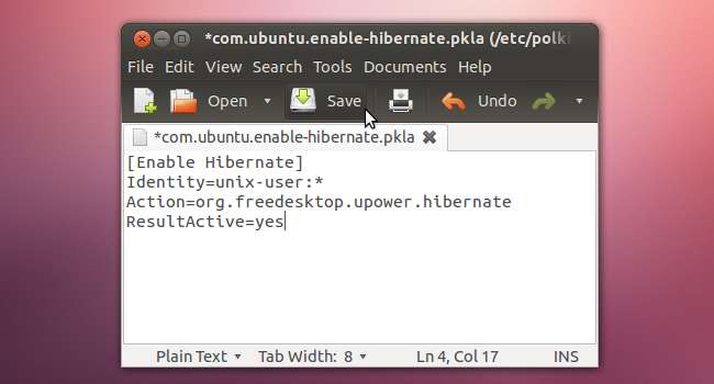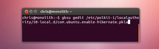 gksu gedit /etc/polkit-1/localauthority/50-local.d/com.ubuntu.enable-hibernate.pkla