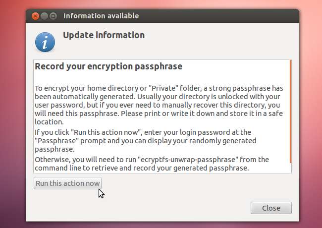 यदि आप एक एन्क्रिप्टेड उबंटू होम निर्देशिका का उपयोग करते हैं, तो आपको अपने माउंट पासफ़्रेज़ की एक बैकअप प्रतिलिपि रखनी चाहिए। आपको एक डायलॉग दिखाई देगा जो आपको ऐसा करने के लिए प्रेरित कर रहा है अपने घर निर्देशिका एन्क्रिप्ट । इस पासफ़्रेज़ को लिखें और इसे कहीं सुरक्षित रखें - आपको भविष्य में अपनी फ़ाइलों को पुनर्प्राप्त करने के लिए इसकी आवश्यकता हो सकती है।