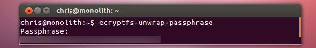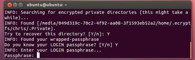 यह मानकर कि आपके सिस्टम पर लिपटी हुई पासफ़्रेज़ फ़ाइल मिली है, यह आपको आपके लॉगिन पासफ़्रेज़ के लिए संकेत देगा। यदि यह फ़ाइल नहीं मिली है, तो आपको माउंट पासफ़्रेज़ की आवश्यकता होगी ecryptfs-खोलना-पदबंध कमांड - उम्मीद है कि आपके पास इसकी एक प्रति होगी। यदि आप नहीं करते हैं, तो आप अपनी फ़ाइलों को पुनर्प्राप्त नहीं कर सकते।