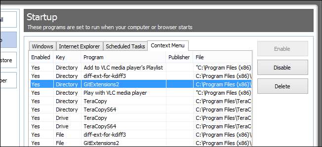 CCleaner की क्षमता भी है प्रबंधित करें कि आपके संदर्भ मेनू में कौन से विकल्प दिखाई देते हैं । दुर्भाग्य से, CCleaner हमेशा सब कुछ नहीं पकड़ता है - इसने मुझे यहां SkyDrive Pro विकल्प को हटाने की अनुमति नहीं दी।