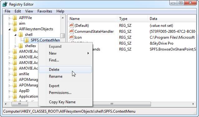 शेल कुंजी का विस्तार करें और आपको एक कुंजी दिखाई देगी जिसका नाम है SPFS.ContextMenu। SPFS.ContextMenu कुंजी को राइट-क्लिक करें और हटाएं चुनें।