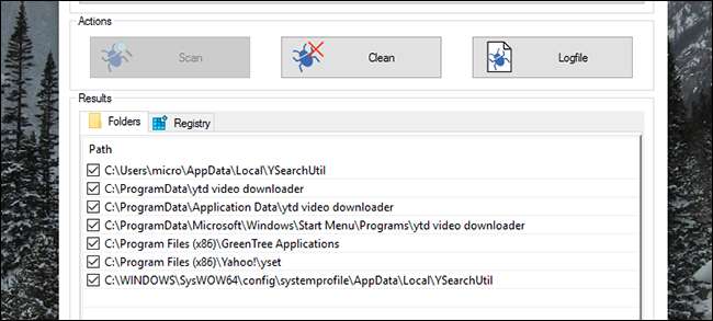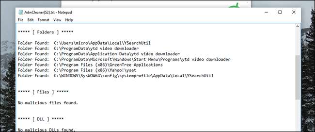 AdwCleaner चार प्रकार के मैलवेयर को इंगित करता है, कुछ अलग टैब में फैलता है (मेरे मामले में, "फ़ोल्डर" और "रजिस्ट्री"। यह शामिल करने का प्रयास करेगा: