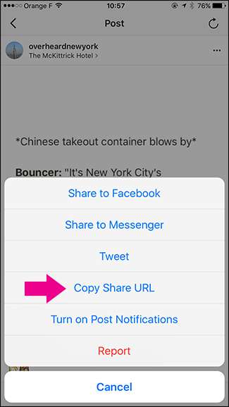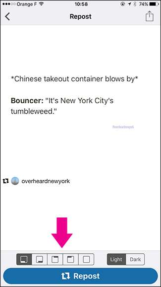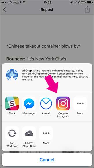 जब आप पोस्ट साझा करने के लिए तैयार हों, तो “रिपॉस्ट” बटन पर टैप करें। पॉपअप साझाकरण मेनू पर, "इंस्टाग्राम पर कॉपी करें" चुनें। यह Instagram के संपादक में पोस्ट खोलता है।