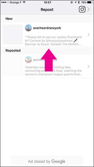 इसके बाद, रेपोस्ट ऐप खोलें। जिस पोस्ट को आप साझा करना चाहते हैं, उसे "न्यू" अनुभाग में आयात और सूचीबद्ध किया जाएगा। आपको इसे वहां चिपकाना भी नहीं है