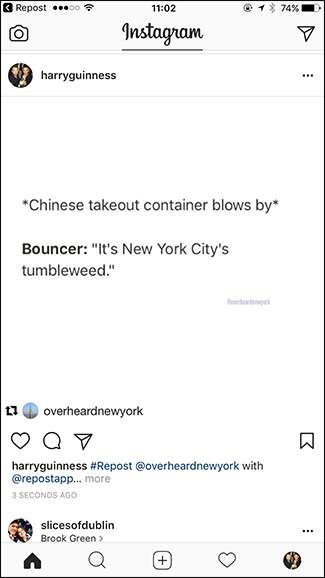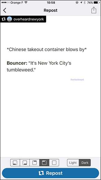 जो भी कारण हो, इंस्टाग्राम केवल आपको देता है अन्य लोगों के पोस्ट को सीधे निजी संदेशों के माध्यम से साझा करें । शुक्र है कि इंस्टाग्राम एक स्पष्ट आवश्यकता को नजरअंदाज कर रहा है, तीसरे पक्ष के ऐप ने इस सुविधा को जोड़ने के लिए कदम बढ़ाया है। उनमें से हमारा पसंदीदा रेपोस्ट है ( आईओएस , एंड्रॉयड ) क्योंकि इसे एक महान मुफ्त संस्करण मिला है जो केवल उस खाते के नाम के साथ एक छोटा वॉटरमार्क जोड़ता है जिससे आप पोस्ट साझा कर रहे हैं। $ 4.99 के लिए एक प्रो उन्नयन भी है जो आपको बिना वॉटरमार्क के फ़ोटो पोस्ट करने देता है और इन-ऐप विज्ञापन निकालता है लेकिन यह आवश्यक नहीं है।
