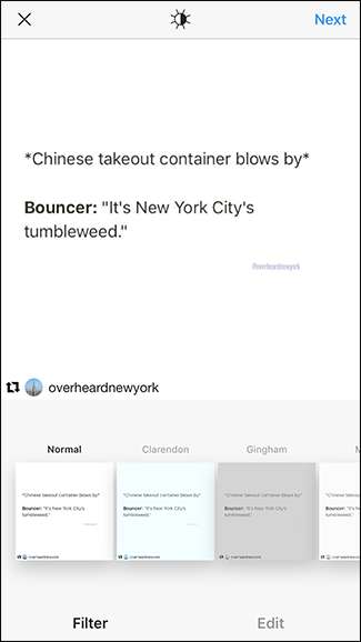 एक फ़िल्टर जोड़ें या बस "अगला" टैप करें। छवि को आयात करने के अलावा, रेपोस्ट आपके क्लिपबोर्ड में मूल कैप्शन को भी कॉपी करता है। इसे अपने रेपोस्ट में जोड़ने के लिए, बस क्लिपबोर्ड को "कैप्शन जोड़ें" बॉक्स में पेस्ट करें।