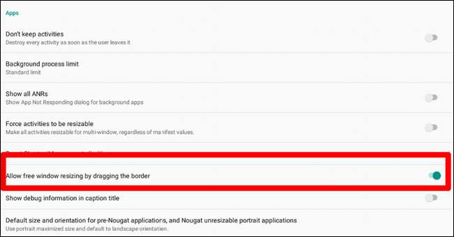 सबसे नीचे, "बॉर्डर को खींचकर मुक्त विंडो को आकार दें" विकल्प ढूंढें और इसे सक्षम करें। ठीक उसी तरह, आप Android ऐप्स का आकार बदल सकेंगे। ध्यान रखें कि यह सभी ऐप्स के साथ काम नहीं करता है - यदि उन्हें कुछ समय में अपडेट नहीं किया गया है, तो वे इसके लिए समर्थन नहीं करेंगे। कई आधुनिक एप्लिकेशन (अच्छे डेवलपर्स के साथ) बोर्ड पर होने चाहिए, हालांकि।