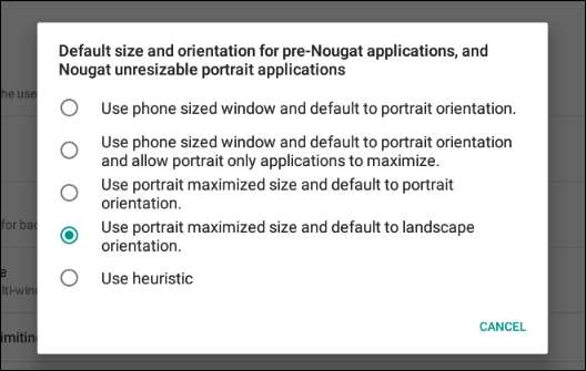 अब, आप यहां रुक सकते हैं और समाप्त हो सकते हैं, लेकिन एक और विकल्प यह है कि मुझे लगता है कि आपको जांचना चाहिए, जो उन ऐप्स के लिए डिफ़ॉल्ट आकार निर्धारित करेगा जो एंड्रॉइड नौगट के लिए डिज़ाइन नहीं किए गए हैं।