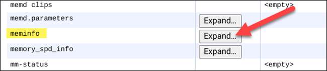 यह देखने के लिए कि आपके पास कितनी रैम है, "Meminfo" प्रविष्टि की तलाश करें, और उसके बाद "विस्तार करें" पर क्लिक करें।