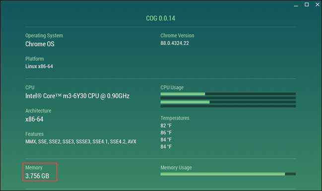 विस्तारित सूचना पैनल में, आप शीर्ष पर "memtotal" और "memavailable" देखेंगे। संख्या किलोबाइट्स (केबी) में हैं, जो आप पहली संख्या के बाद दशमलव डालकर गीगाबाइट्स (जीबी) में अनुवाद कर सकते हैं (लगभग)। उदाहरण के लिए, मेरे Chromebook में 3,938,392 केबी रैम है, इसलिए यह लगभग 3.9 जीबी है।