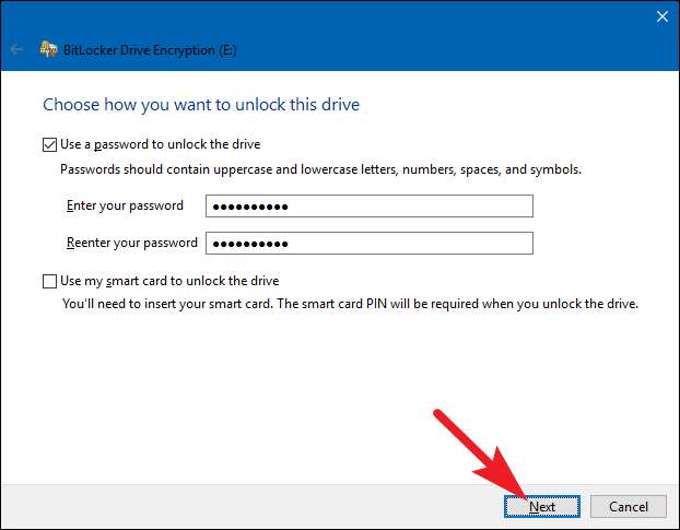 यदि आप एक गैर-सिस्टम ड्राइव या हटाने योग्य ड्राइव को एन्क्रिप्ट कर रहे हैं, तो आपको केवल दो विकल्प दिखाई देंगे (चाहे आपके पास टीपीएम हो या नहीं)। आप ड्राइव को पासवर्ड या स्मार्ट कार्ड (या दोनों) से अनलॉक कर सकते हैं।