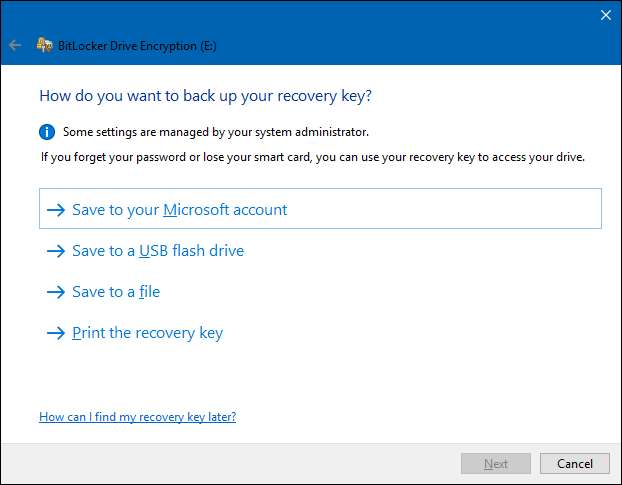 आप अपनी कुंजी को सहेज सकते हैं माइक्रोसॉफ्ट खाता , एक USB ड्राइव, एक फ़ाइल, या यहां तक कि इसे प्रिंट करें। ये विकल्प समान हैं चाहे आप किसी सिस्टम या गैर-सिस्टम ड्राइव को एन्क्रिप्ट कर रहे हों।