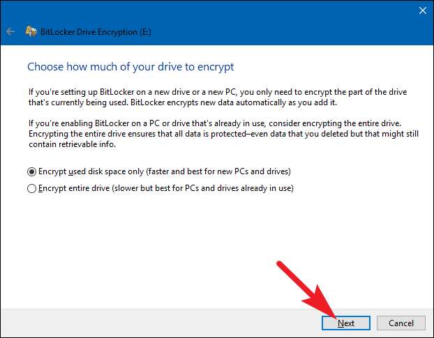 जैसे ही आप उन्हें जोड़ते हैं, BitLocker स्वचालित रूप से नई फ़ाइलों को एन्क्रिप्ट करता है, लेकिन आपको यह चुनना होगा कि वर्तमान में आपके ड्राइव पर मौजूद फ़ाइलों के साथ क्या होता है। आप संपूर्ण ड्राइव को एन्क्रिप्ट कर सकते हैं - जिसमें मुक्त स्थान शामिल है - या प्रक्रिया को तेज करने के लिए उपयोग की गई डिस्क फ़ाइलों को एन्क्रिप्ट करें। ये विकल्प भी समान हैं कि आप किसी सिस्टम या गैर-सिस्टम ड्राइव को एन्क्रिप्ट कर रहे हैं या नहीं।