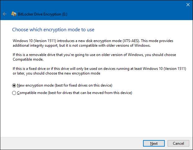विंडोज 10 ने XTS-AES नाम से एक नया एन्क्रिप्शन तरीका पेश किया। यह विंडोज 7 और 8. में उपयोग किए गए एईएस पर बढ़ी हुई अखंडता और प्रदर्शन प्रदान करता है। यदि आप जानते हैं कि आप जिस ड्राइव को एन्क्रिप्ट कर रहे हैं वह केवल विंडोज 10 पीसी पर उपयोग होने वाला है, तो आगे बढ़ें और "नया एन्क्रिप्शन मोड" विकल्प चुनें। यदि आपको लगता है कि आपको किसी बिंदु पर विंडोज के पुराने संस्करण के साथ ड्राइव का उपयोग करने की आवश्यकता हो सकती है (विशेषकर यदि यह एक हटाने योग्य ड्राइव है), तो "संगत मोड" विकल्प चुनें।
