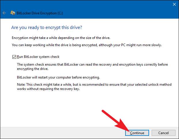 यदि आप अपने सिस्टम ड्राइव को एन्क्रिप्ट कर रहे हैं, तो आपको BitLocker सिस्टम चेक चलाने और अपने सिस्टम को पुनरारंभ करने के लिए कहा जाएगा। सुनिश्चित करें कि विकल्प चुना गया है, "जारी रखें" बटन पर क्लिक करें, और फिर पूछे जाने पर अपने पीसी को पुनरारंभ करें। पहली बार पीसी बूट बैक अप के बाद, विंडोज ड्राइव को एन्क्रिप्ट करता है।