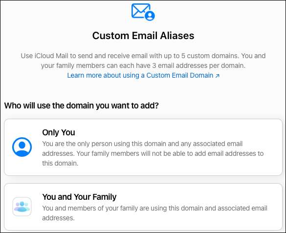 ध्यान दें: आपका बटन "कस्टम ईमेल उपनामों का उपयोग करने" के बजाय "प्रबंधित करें" कह सकता है। [2 9]आपसे पूछा जाएगा कि क्या आप इसे अपने या आपके और आपके परिवार के लिए सेट अप करना चाहते हैं। अगर तुम परिवार साझा करने का उपयोग करें , यह प्रत्येक परिवार के सदस्य को डोमेन के लिए तीन ईमेल पते का उपयोग करने की अनुमति देता है। "केवल आप" या "आप और आपका परिवार" चुनें।