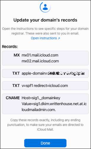अगला चरण आपके डोमेन के रिकॉर्ड कॉपी और अपडेट करना है। चरण 3 के लिए "व्यू" पर क्लिक करें और आपको एक विंडो दिखाई देने वाली सेटिंग्स के साथ दिखाई देगी। आप प्रत्येक रिकॉर्ड के लिए टेक्स्ट का चयन और कॉपी कर सकते हैं। फिर, बस उन्हें अपने रजिस्ट्रार के लिए सही स्थान पर पेस्ट करें, जैसे गोडाडी, या अपनी ज़ोन फ़ाइल को संशोधित करें यदि आप अपने स्वयं के DNS का प्रबंधन करते हैं। जब आप समाप्त करते हैं तो "संपन्न" पर क्लिक करें।