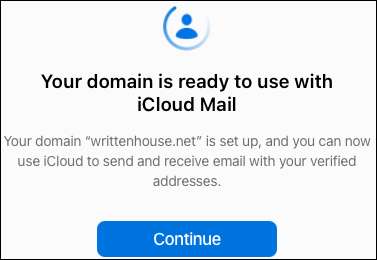 एक पल के बाद, आपको एक पुष्टिकरण देखना चाहिए कि आपका डोमेन iCloud मेल के साथ उपयोग करने के लिए तैयार है। "जारी रखें" पर क्लिक करें।