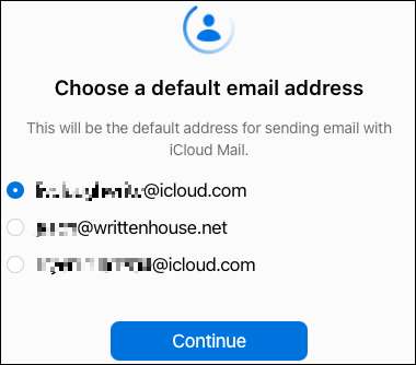 फिर आपको यह पूछा जाएगा कि आप किस ईमेल पते को डिफ़ॉल्ट के रूप में उपयोग करना चाहते हैं। पता चुनें और "जारी रखें" पर क्लिक करें।