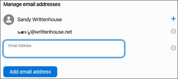 अपने नाम के दाईं ओर प्लस साइन पर क्लिक करें। नया ईमेल पता दर्ज करें और "ईमेल पता जोड़ें" पर क्लिक करें।
