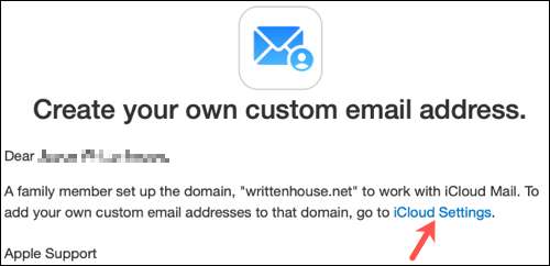 यदि आप अपने परिवार के उपयोग के लिए कस्टम डोमेन सेट अप करते हैं, तो प्रत्येक परिवार के सदस्य को अपने परिवार को ऐप्पल आईडी साझा करने वाले पते पर एक ईमेल प्राप्त होगा। वे ईमेल में iCloud सेटिंग्स लिंक पर क्लिक कर सकते हैं और अपने ईमेल पते को स्थापित करने के लिए संकेतों का पालन कर सकते हैं।