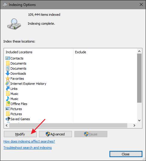 "अनुक्रमण विकल्प" विंडो में, "संशोधित करें" बटन पर क्लिक करें।