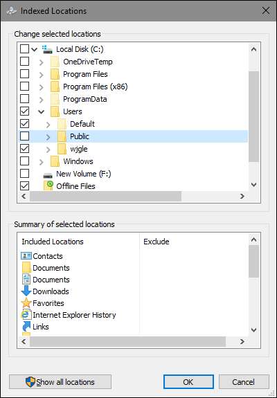 और फिर इंडेक्स में शामिल फ़ोल्डर का चयन करने के लिए "अनुक्रमित स्थान" विंडो का उपयोग करें।